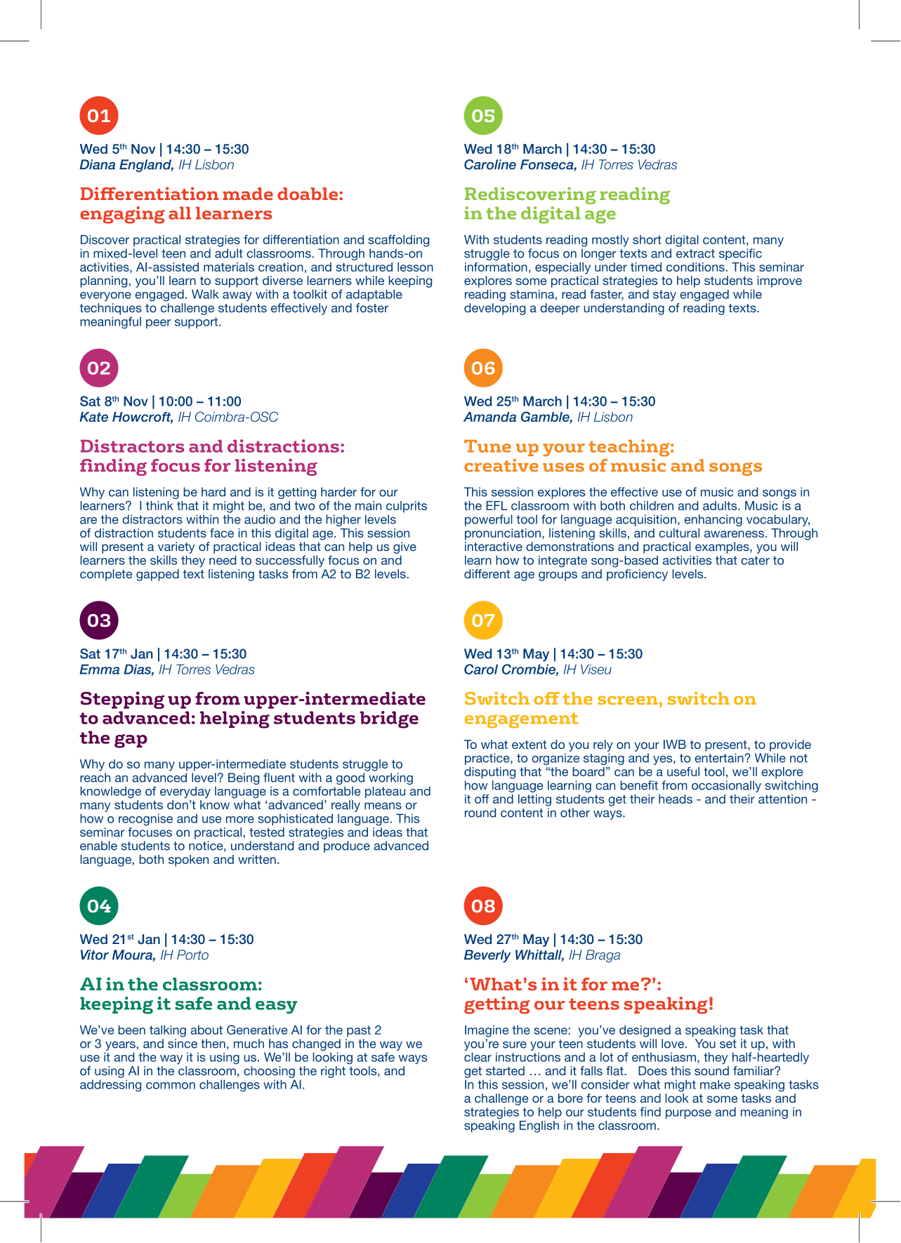 - The Teacher Development sessions, where the focus is on the classroom, ranging from sessions for VYLs to teaching Adults.